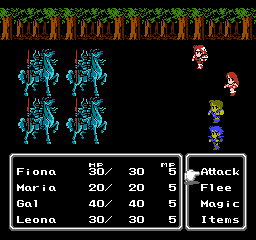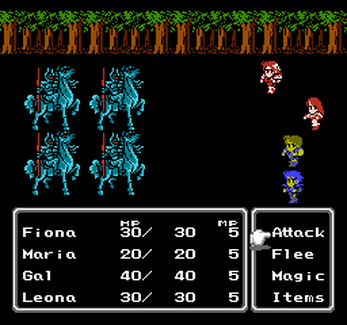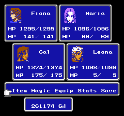 I did it again. As with FF1, I've made the main characters of FF2 women. Note this applies only to Firion (now Fiona), Leon (now Leona), and Guy (now Gal) -- the temporary party members are not adjusted.
